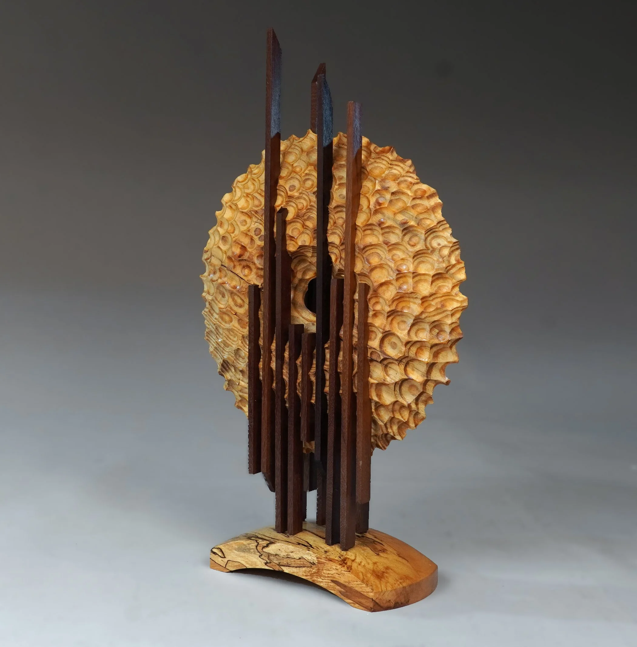 Working from his 1,600-square-foot studio south of St. Louis, Jerry blends furniture-making techniques with woodturning and carving. His narrative-driven works sometimes incorporate other media or found objects, a signature style he discovered in 2003. Since committing to his practice full-time in 2023, Jerry continues to refine his pursuit of perfect form.