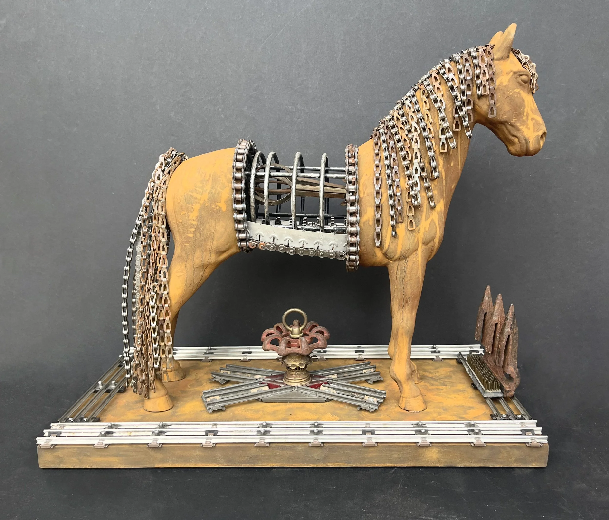 Specializing in thought-provoking pieces, Michelle Lamb manipulates found objects, re-contextualizing them to fit unconventional narratives. Meticulous remodifications make objects integral to the whole, creating identification riddles for the viewer. Lamb prefers deconstructing obsolete machinery and using vintage gadgets for their patina. Having received numerous awards, she's had art displayed at Republic Plaza, art venues around Colorado, and in the collections of Kaiser Permanente, the City of Littleton, and RTD. A multidisciplinary artist, Lamb received her BFA from CSU and has taught various forms of sculpture locally, nationally, and internationally.